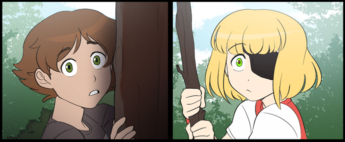 A young girl plays in the stream at the bottom of a hill. She is very small in stature, and she wears an eyepatch over her left eye. A long stick is grasped in her hands, and she uses it as she walks through the water. She hears a sound up the hill, catching her attention. There’s a boy up there, hiding behind a tree. The girl is frightened. She wasn’t expecting to run into anyone out here.