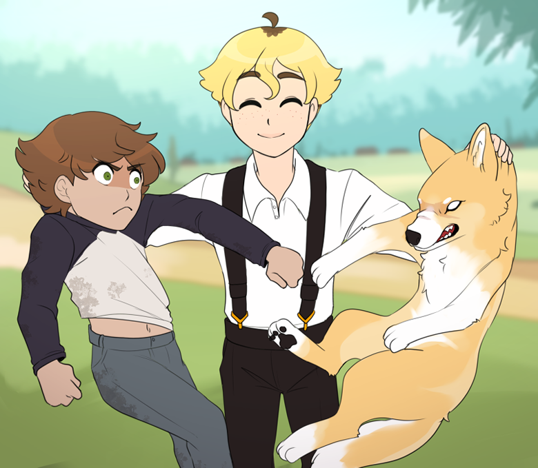 Daine and Kane could do no more than stare as they watch the fight. It didn’t take long, however, for another person to get involved. Suddenly, the tussling children found themselves pulled apart. Shadow is being held by the collar of his shirt, while Elaine is held by the scruff of her neck. The boy in between them smiles, his eyes happily closed. He holds them apart with little effort.