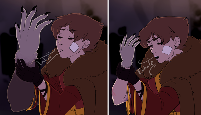 "SHIT!" he yells, holding his massive arm with his human one. He closes his eyes and calms his breath. In through his nose, out through his mouth. He repeats these breaths one after another, and slowly his arm starts shrinking back to its original size.