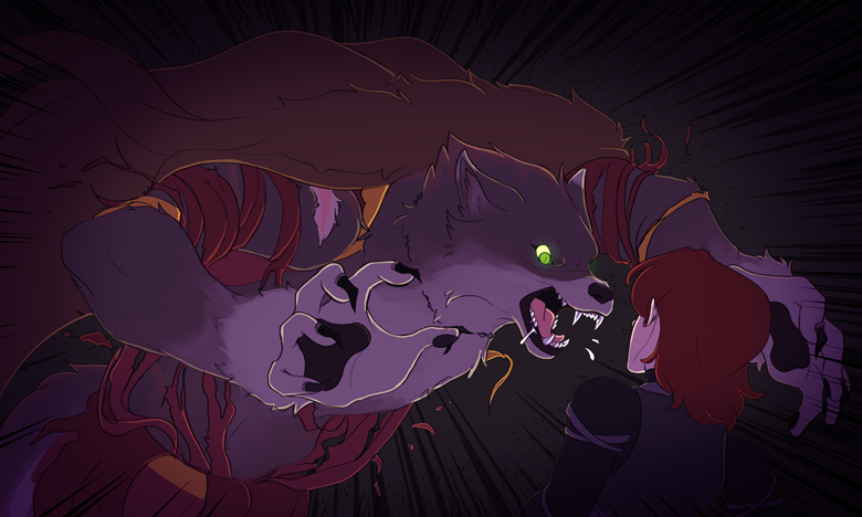"SHUT UUUUUUUUUUUUUGGHHHHFF!" he screams with a growl, no longer able to form the words. He towers over Leonard, holding out the same massive arms as before, now with a body to match. Standing on two legs, he's become a giant lycanthropous beast. With the head of a wolf and the body of a man, he bares his fangs over Leonard, his muzzle upturned in a terrifying scowl.