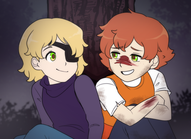 Kane stares, trying his best to slow down his sobbing. Eventually the two children sit next to each other at the base of a nearby tree. Kane is slowly calming down, Daine gently rubbing his back.