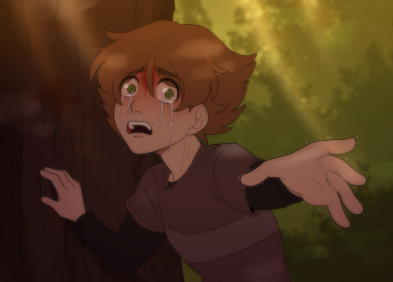 Daine immediately dashes to his side. He turns around, now sitting at the base of the tree. Burying his head in his knees, he continues sobbing. Daine sits next to him, rubbing his back.